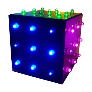 The cube has five sides with nine super bright, 5 mm LEDs on each side. The kit includes red, blue, green, white, orange, pink, and yellow LEDs. It also comes with a switch, battery holder, and terminal block so you can connect to a USB or other 5V power supply. Extra LEDs, resistors, and transistors included at no extra charge! A 24 page color manual is also included.